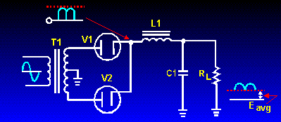 Now look at figure 3-31, which illustrates a complete cycle of operation where a full-wave rectifier circuit is used to supply the input voltage to the filter. The rectifier voltage is developed across capacitor C1. The ripple voltage in the output of the filter is the alternating component of the input voltage reduced in amplitude by the filter section. Figure 3-31. - Filtering action of an LC choke-input filter.