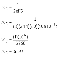 Each time the plate of a diode goes positive with respect to the cathode, the diode conducts and C1 charges. Conduction occurs twice during each cycle for a full-wave rectifier. For a 60-hertz supply, this produces a ripple frequency of 120 hertz. Although the diodes alternate (one conducts while the other is nonconducting), the filter input voltage is not steady. As the plate voltage of the conducting diode increases (on the positive half of the cycle), capacitor C1 charges-the charge being limited by the impedance of the secondary transformer winding, the diode's forward (cathode-to-plate) resistance, and the counter emf developed by the choke. During the nonconducting interval, (when the plate voltage drops below the capacitor charge voltage), C1 discharges through the load resistance RL. The components in the discharge path cause a long time constant; thus C1 discharges slower than it charges. The choke (L1) is usually of a large value, on the order of 1 to 20 henries, and offers a large inductive reactance to the 120-hertz ripple component produced by the rectifier. Therefore, the effect that L1 has on the charging of the capacitor (C1) must be considered. Since L1 is connected in series with the parallel branch consisting of C1 and RL, a division of the ripple ac voltage and the output dc voltage occurs. The greater the impedance of the choke, the less the ripple voltage that appears across C1 and the output. The dc output voltage is fixed mainly by the dc resistance of the choke. Now that you have read how the LC choke-input filter functions, let's take a look at it using actual component values. For simplicity, the input frequency at the primary of the transformer will be 117 volts 60 hertz. We will use both half-wave and full-wave rectifier circuits to provide the input to the filter. Starting with the half-wave configuration as shown in figure 3-32, the basic parameters are: with 117 volts ac rms applied to the T1 primary, 165 volts ac peak-to-peak is available at the secondary [(117 V) X (1.414) = 165 V]. You should recall that the ripple frequency of this half-wave rectifier is 60 hertz. Therefore, the capacitive reactance of C1 is: