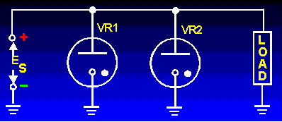 VR Tubes Connected in Parallel One might expect that connecting VR tubes in parallel as shown in figure 3-47 would increase the current handling capacity of the network. Although this is true for some gas-filled tubes, it is not true for VR tubes. In figure 3-47, two VR tubes are constructed in exactly the same way. The only difference will be a slight variation in their ionization potential. For the purpose of this discussion, VR tube VR1 will have a lower ionization potential than VR2. The potential that must be reached before a VR tube ionizes is considerably higher than its normal operating voltage. Figure 3-47. - VR tubes connected in parallel.