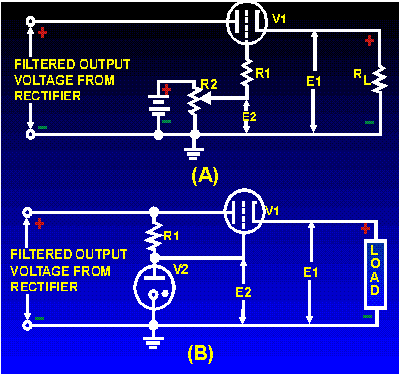 When voltage is applied to the circuit of figure 3-47, as soon as the correct potential is reached, VR1 begins to conduct and the potential across it decreases to its operating voltage. The potential across VR2 never becomes high enough to cause it to ionize. Therefore, placing the VR tubes in parallel accomplishes no useful purpose. When greater current handling capacity and better regulation are desired, electronic (vacuum tube) regulator circuits are used. Several conditions may either indicate or cause problems with a VR tube regulator. Initially, you can get some indication of the trouble associated with a gas-tube regulator circuit by visually inspecting it to determine the presence of the characteristic glow from the ionized gas within the tube. When current through the tube is near its maximum rating, the tube is highly ionized. When the current is near its minimum rating, the tube is lightly ionized, Therefore, the intensity of the gaseous discharge within the tube is an indication of tube conduction. If the tube is not ionized, however, this does not necessarily mean that the tube is defective. The same indication (lack of characteristic glow) may also result from the following conditions: the series resistor (RS) has increased in value, the dc input voltage (ES) is below normal, the load current is below normal, or the load current is excessive. You therefore need to make dc voltage measurements at the input and output terminals of the voltage regulator circuit to determine whether the problem is inside the regulator circuit or outside of it. You can check value of the series resistor (RS) by using ohmmeter measurements to determine whether any change in resistance has occurred. If the maximum current rating of the regulator tube is exceeded for a considerable length of time, the tube may be damaged and lose its regulation characteristics; therefore, you can suspect the regulator tube itself as a possible source of trouble. Although VR tubes are used extensively in electronic equipment, there are circuits that require a greater degree of regulation than a VR tube can provide. For these circuits, an electron tube voltage regulator is used. Electron Tube Voltage Regulator An electron tube may be considered a variable resistance. When the tube is passing a direct current, this resistance is simply the plate-to-cathode voltage divided by the current through the tube and is called the dc plate resistance (Rp). For a given plate voltage, the value of Rp depends upon the tube current, and the tube current depends upon the grid bias. Refer to figure 3-48, view (A). The resistance of V1 is established initially by the bias on the tube. Assume that the voltage across the load is at the desired value. Then the cathode is positive with respect to ground by some voltage (EL). The grid can be made positive relative to ground by a voltage (E2) that is less than E1. The potentiometer R2 is adjusted until the bias (grid-to-cathode voltage), which is E2 - E1, is sufficient to allow V1 to pass a current equal to the desired load current. With this bias, the resistance of V1 is established at the proper value to reduce the rectifier output voltage to the desired load voltage. Figure 3-48. - Electron tube voltage regulator using a battery for the fixed bias