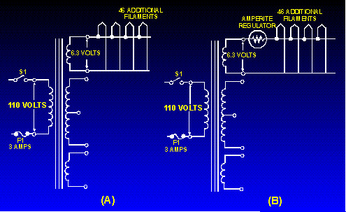 tells you that the filaments draw .315 amperes. You should know from your previous study that as conductors are heated, their resistance increases. Therefore, the cold resistance of the filaments is considerably lower than the hot resistance. In this case, assume 100 ohms per filament. The total resistance of the 50 parallel filaments is then 2 ohms when the power supply is first energized, and the filaments draw 3.15 amperes of current. If the current for the rest of the power supply is added to the filament current, the surge current will cause the power supply to draw 5 amperes when it is first energized. Unfortunately, the power supply is fused at 3 amperes. Under these conditions, it would be impossible to keep the power supply on the line long enough to get the filaments up to operating temperature. There are three possible solutions to this problem. The first is simply to fuse the power supply at 5 amperes, but this could allow excessive current to flow in the power supply. Another solution is to use a slow-blow fuse. Unfortunately, the duration of the current surge may exceed the time limit that a slow-blow fuse can handle. Therefore, current regulation is the best solution to this problem. Because of its quick-heating ability, the amperite tube is ideal as a current regulator. The amperite regulator is nothing more than an iron wire enclosed in a hydrogen-filled envelope. Because of its construction, the iron filament will heat quickly when current is applied to it. View (B) of figure 3-49 shows the amperite regulator connected in series with the filaments of the load. When the power supply is first energized, the iron wire of the amperite gets hot quickly and presents a large resistance connected in series with the 2 ohms of filament resistance. As a result, most of the voltage is dropped across the amperite. Because of the large resistance of the amperite regulator, current in the circuit is held to an acceptable level in accordance with Ohm's law: