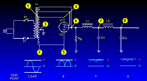 TROUBLESHOOTING POWER SUPPLIES Whenever you work with electricity, you must follow all the appropriate safety precautions. In the front of all electronic technical manuals, you will always find a section on safety precautions. You should also find posted on each piece of equipment a sign listing the specific precautions for that equipment. One hazardous area that is sometimes overlooked, especially on board ship, is grounding of equipment. By grounding the return side of the power transformer to the metal chassis, manufacturers can wire the cathodes of the tubes in both the power supply and the load being supplied by the power supply directly to the metal chassis. This eliminates the necessity of wiring each tube directly to the return side of the transformer, saving wire, and reducing the cost of building the equipment. While this solves one of the problems of the manufacturer, it creates a problem for you, the technician. Unless the chassis is physically grounded to the ship's ground (the hull), the chassis can be charged (or can float) several hundred volts above ship's ground. If you come in contact with the metal chassis at the same time you are in contact with the ship's hull, the current from the chassis can use your body as a low resistance path back to the ship's ac generators. At best this can be an unpleasant experience; at worst it can be fatal. For this reason Navy electronic equipment is always grounded to the ship's hull, and approved rubber mats are required in all spaces where electronic equipment is present. Therefore, before you start to work on any electronic or electrical equipment ALWAYS ENSURE THAT THE EQUIPMENT AND ANY TEST EQUIPMENT YOU ARE USING IS PROPERLY GROUNDED AND THAT THE RUBBER MAT YOU ARE STANDING ON IS IN GOOD CONDITION. As long as you follow these simple rules, you should be able to avoid the possibility of becoming an electrical conductor. TESTING There are two widely used checks in testing electronic equipment. The first is the VISUAL CHECK. Do not underestimate the importance of this check. Many technicians find defects right away simply by looking for them. A visual check does not take long; in fact you should be able to see the problem in about 2 minutes if it is the kind of problem that can be seen. You should learn the following procedure. You will find yourself using it quite often, as it is good not only for power supplies but also for any other type of electronic equipment you may be troubleshooting. 1. BEFORE YOU PLUG IN THE EQUIPMENT, LOOK FOR: LOOSE TUBES - A tube that is not properly seated in its socket may not be making proper contact with the rest of the circuit. It may very well be the source of your problem. Push the tube completely into place. SHORTS - Examine any terminal or connection that is close to the chassis or to any other terminal for the possibility of a short. A short in any part of the power supply can cause considerable damage. Look for and remove any stray drops of solder, bits of wire, nuts, or screws. It sometimes helps to shake the chassis and listen for any tell-tale rattles. Remember to correct any problem that may cause a short circuit. If it is not causing trouble now, it may cause problems in the future. DISCOLORED OR LEAKING TRANSFORMER - This is a sure sign that there is a short somewhere. Locate it. If the equipment has a fuse, find out why the fuse did not blow; too large a size may have been installed, or there may be a short across the fuse holder. LOOSE, BROKEN, OR CORRODED CONNECTIONS - Any connection that is not in good condition is a trouble spot If it is not causing problems now, it probably will in the future. Fix it. DAMAGED RESISTORS OR CAPACITORS - A resistor that is discolored or charred has been subjected to an overload. An electrolytic capacitor will show a whitish deposit at the seal around the terminals. Check for a short whenever you notice a damaged resistor or capacitor. If there is no short, the trouble may be that the power supply has been overloaded in some way. Make a note to replace the part after signal tracing. There is no sense in risking a new part until you have located the trouble. 2. PLUG IN THE POWER SUPPLY AND LOOK FOR: SMOKING PARTS - If any part smokes or if you hear any boiling or sputtering sounds, pull the plug immediately. There is a short circuit somewhere that you have missed in your first inspection. Use an ohmmeter to check the part again; begin in neighborhood of the smoking part. COLD TUBES - After allowing the equipment about two minutes for warm-up, touch all the tubes. If a tube is cold, it is either burned out or there is a break in the heater connections and the tube is not receiving proper heater voltage. Remove the tube and connect an ohmmeter across the heater terminals to see if the filament is open (reads almost infinite resistance). If the filament reads open, it is burned out. Replace the bad tube with a good one. If the filament reads a low resistance, this indicates that the filament is all right. Use an ac voltmeter to find the break between the filament and the output of the transformer. SPARKING - Tap or shake the chassis. If you see or hear sparking, you have located a loose connection or a short. Check and repair the problem. If you locate and repair any of the defects listed under the visual check, make a note of what you find and what you do to correct it. It is quite probable you have found the trouble. However, a good technician takes nothing for granted. You must prove to yourself that the equipment is operating properly and that no other troubles exist. If you find none of the defects listed under the visual check, go ahead with the signal tracing procedure. The trouble is probably of such a nature that you cannot see it directly with your eye-you must see it through the eye of the oscilloscope. The second type of testing is signal tracing. Tracing the ac signal through the equipment is the most rapid method of locating a trouble that yo