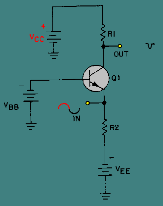 TRANSISTOR AMPLIFIERS A transistor amplifier is a current-control device. The current in the base of the transistor (which is dependent on the emitter-base bias) controls the current in the collector. A vacuum-tube amplifier is also a current-control device. The grid bias controls the plate current. These facts are expanded upon in NEETS Module 6, Introduction to Electronic Emission, Tubes and Power Supplies, and Module 7, Introduction to Solid-State Devices and Power Supplies. You might hear that a vacuum tube is a voltage-operated device (since the grid does not need to draw current) while the transistor is a current-operated device. You might agree with this statement, but both the vacuum tube and the transistor are still current-control devices. The whole secret to understanding amplifiers is to remember that fact. Current control is the name of the game. Once current is controlled you can use it to give you a voltage gain or a power gain. This chapter will use transistor amplifiers to present the concepts and principles of amplifiers. These concepts apply to vacuum-tube amplifiers and, in most cases, magnetic amplifiers as well as transistor amplifiers. If you wish to study the vacuum-tube equivalent circuits of the transistor circuits presented, an excellent source is the EIMB, NAVSEA 0967-LP-000-0120, Electronics Circuits. The first amplifier concept that is discussed is the "class of operation" of an amplifier. AMPLIFIER CLASSES OF OPERATION The class of operation of an amplifier is determined by the amount of time (in relation to the input signal) that current flows in the output circuit. This is a function of the operating point of the amplifying device. The operating point of the amplifying device is determined by the bias applied to the device. There are four classes of operation for an amplifier. These are: A, AB, B and C. Each class of operation has certain uses and characteristics. No one class of operation is "better" than any other class. The selection of the "best" class of operation is determined by the use of the amplifying circuit. The best class of operation for a phonograph is not the best class for a radio transmitter. A simple transistor amplifier that is operated class A is shown in figure 1-4. Since the output signal is a 100% (or 360) copy of the input signal, current in the output circuit must flow for 100% of the input signal time. This is the definition of a class A amplifier. Amplifier current flows for 100% of the input signal. Figure 1-4. - A simple class A transistor amplifier. The class A amplifier has the characteristics of good FIDELITY and low EFFICIENCY. Fidelity means that the output signal is just like the input signal in all respects except amplitude. It has the same shape and frequency. In some cases, there may be a phase difference between the input and output signal (usually 180), but the signals are still considered to be "good copies." If the output signal is not like the input signal in shape or frequency, the signal is said to be DISTORTED. DISTORTION is any undesired change in a signal from input to output. The efficiency of an amplifier refers to the amount of power delivered to the output compared to the power supplied to the circuit. Since every device takes power to operate, if the amplifier operates for 360 of input signal, it uses more power than if it only operates for 180 of input signal. If the amplifier uses more power, less power is available for the output signal and efficiency is lower. Since class A amplifiers operate (have current flow) for 360 of input signal, they are low in efficiency. This low efficiency is acceptable in class A amplifiers because they are used where efficiency is not as important as fidelity. If the amplifying device is biased in such a way that current flows in the device for 51% - 99% of the input signal, the amplifier is operating class AB. A simple class AB amplifier is shown in figure 1-5. Figure 1-5. - A simple class AB transistor amplifier. Notice that the output signal is distorted. The output signal no longer has the same shape as the input signal. The portion of the output signal that appears to be cut off is caused by the lack of current through the transistor. When the emitter becomes positive enough, the transistor cannot conduct because the base-to-emitter junction is no longer forward biased. Any further increase in input signal will not cause an increase in output signal voltage. Class AB amplifiers have better efficiency and poorer fidelity than class A amplifiers. They are used when the output signal need not be a complete reproduction of the input signal, but both positive and negative portions of the input signal must be available at the output. Class AB amplifiers are usually defined as amplifiers operating between class A and class B because class A amplifiers operate on 100% of input signal and class B amplifiers (discussed next) operate on 50% of the input signal. Any amplifier operating between these two limits is operating class AB. As was stated above, a class B amplifier operates for 50% of the input signal. A simple class B amplifier is shown in figure 1-6. Figure 1-6. - A simple class B transistor amplifier. In the circuit shown in figure 1-6, the base-emitter bias will not allow the transistor to conduct whenever the input signal becomes positive. Therefore, only the negative portion of the input signal is reproduced in the output signal. You may wonder why a class B amplifier would be used instead of a simple rectifier if only half the input signal is desired in the output. The answer to this is that the rectifier does not amplify. The output signal of a rectifier cannot be higher in amplitude than the input signal. The class B amplifier not only reproduces half the input signal, but amplifies it as well. Class B amplifiers are twice as efficient as class A amplifiers since the amplifying device only conducts (and uses power) for half of the input signal. A class B ampl