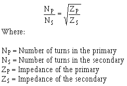 The common-emitter configuration provides a medium input impedance and a medium output impedance. The common-base configuration provides a low input impedance and a high output impedance. The common-collector configuration provides a high input impedance and a low output impedance. The common-collector configuration is often used to provide impedance matching between a high output impedance and a low input impedance. If the amplifier stage is transformer coupled, the turns ratio of the transformer can be selected to provide impedance matching. In NEETS Module 2, Introduction to Alternating Current and Transformers, you were shown the relationship between the turns ratio and the impedance ratio in a transformer. The relationship is expressed in the following formula: