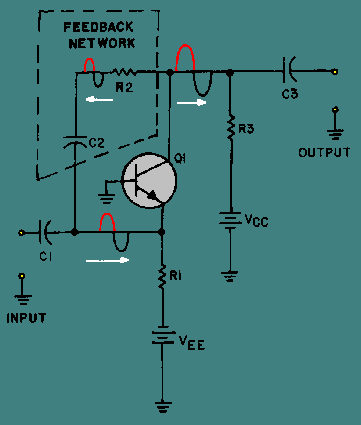 Positive Feedback As you have seen, positive feedback is accomplished by adding part of the output signal in phase with the input signal. In a common-base transistor amplifier, it is fairly simple to provide positive feedback. Since the input and output signals are in phase, you need only couple part of the output signal back to the input. This is shown in figure 1-18. The feedback network in this amplifier is made up of R2 and C2. The value of C2 should be large so that the capacitive reactance (XC) will be low and the capacitor will couple the signal easily. (This is also the case with the input and output coupling capacitors C1 and C3.) The resistive value of R2 should be large to limit the amount of feedback signal and to ensure that the majority of the output signal goes on to the next stage through C3. Figure 1-18. - Positive feedback in a transistor amplifier.