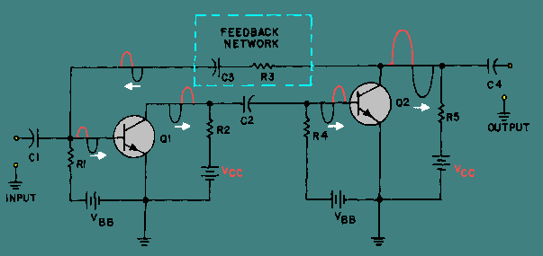 A more common configuration for transistor amplifiers is the common-emitter configuration. Positive feedback is a little more difficult with this configuration because the input and output signals are 180 out of phase. Positive feedback can be accomplished by feeding a portion of the output signal of the second stage back to the input of the first stage. This arrangement is shown in figure 1-19. Figure 1-19. - Positive feedback in two stages of transistor amplification.