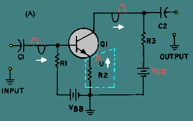 The figure shows that each stage of amplification has a 180 phase shift. This means that the output signal of Q2 will be in phase with the input signal to Q1. A portion of the output signal of Q2 is coupled back to the input of Q1 through the feedback network of C3 and R3. R3 should have a large resistance to limit the amount of signal through the feedback network. C3 should have a large capacitance so the capacitive reactance is low and the capacitor will couple the signal easily. Sometimes positive feedback is used to eliminate the effects of negative feedback that are caused by circuit components. One way in which a circuit component can cause negative feedback is shown in figure 1-20. In view (A) a common-emitter transistor amplifier is shown. An emitter resistor (R2) has been placed in this circuit to provide proper biasing and temperature stability. An undesired effect of this resistor is the development of a signal at the emitter in phase with the input signal on the base. This signal is caused by the changing current through the emitter resistor (R2) as the current through the transistor changes. You might think that this signal on the emitter is a form of positive feedback since it is in phase with the input signal. But the emitter signal is really negative feedback. Current through the transistor is controlled by the base-to-emitter bias. If both the base and emitter become more positive by the same amount at the same time, current will not increase. It is the difference between the base and emitter voltages that controls the current flow through the transistor. To eliminate this negative feedback caused by the emitter resistor, some way must be found to remove the signal from the emitter. If the signal could be coupled to ground (decoupled) the emitter of the transistor would be unaffected. That is exactly what is done. A DECOUPLING CAPACITOR (C3 in view B) is placed between the emitter of Q1 and ground (across the emitter resistor). This capacitor should have a high capacitance so that it will pass the signal to ground easily. The decoupling capacitor (C3) should have the same qualities as the coupling capacitors (C1 and C2) of the circuit. Decoupling capacitors are also called bypass capacitors. Figure 1-20A. - Decoupling (bypass) capacitor in a transistor amplifier.