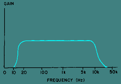 THE IDEAL Frequency response of an audio amplifier is equal gain from 15 Hz to 20 kHz with very low gain outside of those limits.