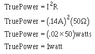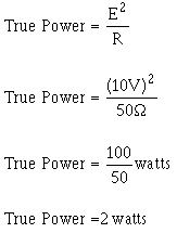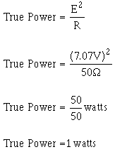 You should notice on the figure that the frequency-response curve shows output voltage (or current) against frequency. The lower and upper frequency limits (f1 and f2) are also known as HALF-POWER POINTS. The half-power points are the points at which the output voltage (or current) is 70.7 percent of the maximum output voltage (or current). Any frequency that produces less than 70.7 percent of the maximum output voltage (or current) is outside the bandwidth and, in most cases, is not considered a useable output of the amplifier. The reason these points are called "half-power points" is that the true output power will be half (50 percent) of the maximum true output power when the output voltage (or current) is 70.7 percent of the maximum output voltage (or current), as shown below. (All calculations are rounded off to two decimal places.) As you learned in NEETS, module 2, in an a.c. circuit true power is calculated using the resistance (R) of the circuit, NOT the impedance (Z). If the circuit produces a maximum output voltage of 10 volts across a 50-ohm load, then: