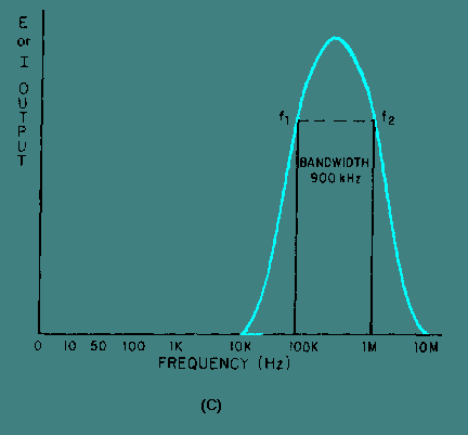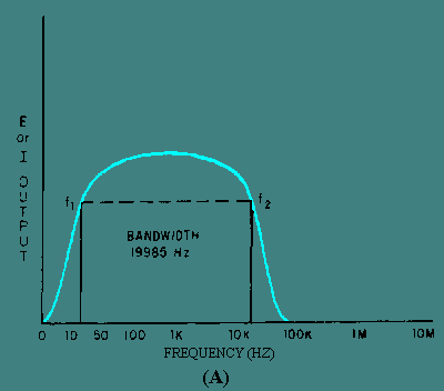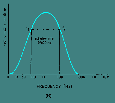Now look at view (C). This frequency-response curve is for an rf amplifier. The frequency limits of this amplifier are 100 kilohertz (f1) and 1 megahertz (f2); therefore, the bandwidth of this amplifier is 900 kilohertz. View (D) shows another audio amplifier. This time the frequency limits are 30 hertz (f1) and 200 hertz (f2). The bandwidth of this amplifier is only 170 hertz. The important thing to notice in view (D) is that the frequency scale is different from those used in other views. Any frequency scale can be used for a frequency-response curve. The scale used would be determined by what frequencies are most useful in presenting the frequency-response curve for a particular amplifier. Q.1 What is the bandwidth of an amplifier? |