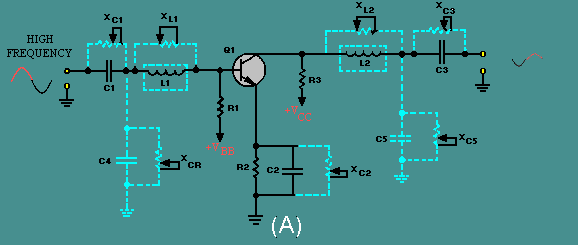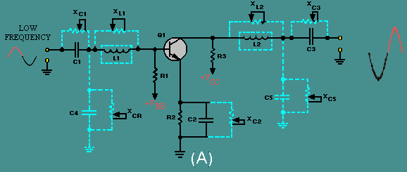 The actual circuit components are: C1, C2, C3, R1, R2, R3, and Q1. C1 is used to couple the input signal. R1 develops the input signal. R2, the emitter resistor, is used for proper biasing and temperature stability. C2 is a decoupling capacitor for R2. R3 develops the output signal. C3 couples the output signal to the next stage. Q1 is the amplifying device. The phantom circuit elements representing the capacitance and inductance of the wiring are: L1, L2, C4, and C5. L1 represents the inductance of the input wiring. L2 represents the inductance of the output wiring. C4 represents the capacitance of the input wiring. C5 represents the capacitance of the output wiring. In view (A) the circuit is shown with a low-frequency input signal. Since the formulas for capacitive reactance and inductive reactance are