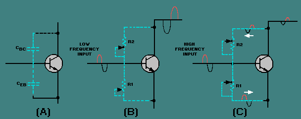 you should remember that if frequency is low, capacitive reactance will be high and inductive reactance will be low. This is shown by the position of the variable resistors that represent the reactances. Notice that XL1 and XL2 are low; therefore, they do not "drop" very much of the input and output signals. XC4 and XC5 are high; these reactances tend to "block" the input and output signals and keep them from going to the power supplies (VBB and VCC). Notice that the output signal is larger in amplitude than the input signal. Now look at view (B). The input signal is a high-frequency signal. Now XC is low and XL is high. XL1 and XL2 now drop part of the input and output signals. At the same time XC4 and XC5 tend to "short" or "pass" the input and output signals to signal ground. The net effect is that both the input and output signals are reduced. Notice that the output signal is smaller in amplitude than the input signal. Now you can see how the capacitance and inductance of the wiring affect an amplifier, causing the output of an amplifier to be less for high-frequency signals than for low-frequency signals. In addition to the other circuit components, an amplifying device (transistor or electronic tube), itself, reacts differently to high frequencies than it does to low frequencies. In earlier NEETS modules you were told that transistors and electronic tubes have interelectrode capacitance. Figure 2-5 shows a portion of the interelectrode capacitance of a transistor and the way in which this affects high- and low-frequency signals. Figure 2-5. - Interelectrode capacitance of a transistor.