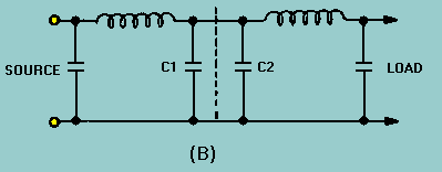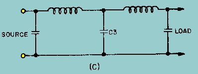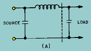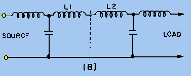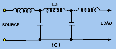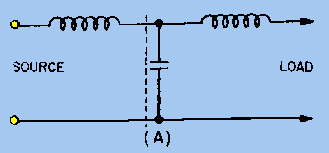 All of the various types of filters we have discussed so far have had only one section. In many cases, the use of such simple filter circuits does not provide sufficiently sharp cutoff points. But by adding a capacitor, an inductor, or a resonant circuit in series or in parallel (depending upon the type of filter action required), the ideal effect is more nearly approached. When such additional units are added to a filter circuit, the form of the resulting circuit will resemble the letter T, or the Greek letter p (pi). They are, therefore, called T- or p-type filters, depending upon which symbol they resemble. Two or more T- or p-type filters may be connected together to produce a still sharper cutoff point.Figure 1-23, (view A) (view B) and (view C), and figure 1-24, (view A) (view B) and (view C) depict some of the common configurations of the T- and p-type filters. Further discussion about the theory of operation of these circuits is beyond the intended scope of this module. If you are interested in learning more about filters, a good source of information to study is the Electronics Installation and Maintenance Handbook (EIMB), section 4 (Electronics Circuits), NAVSEA 0967-LP-000-0120.Figure 1-23A. - Formation of a T-type filter.