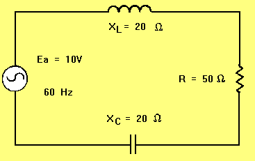 The voltage drops around the circuit with 2 amperes of current flow are: EC = IT X XC EC = 2 X 20 EC = 40 volts a.c. EL = IT X XL EL = 2 X 20 EL = 40 volts a.c. ER = IT X R ER = 2 X 5 ER = 10 volts a.c. You can see that there is a voltage gain across the reactive components at resonance. If the frequency was such that XL and XC were equal to 1000 ohms at the resonant frequency, the reactance voltage across the inductor or capacitor would increase to 2000 volts a.c. with 10 volts a.c. applied. Be aware that potentially high voltage can exist in series-resonant circuits. |