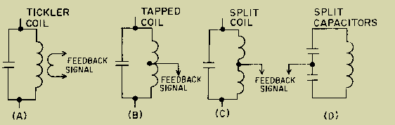 SOLID-STATE LC OSCILLATORS As you have just studied, a basic oscillator can be broken down into three main sections: a frequency-determining device, an amplifier, and a feedback circuit. The frequency-determining device in an LC oscillator is usually an LC tank circuit. Although the tank circuit is normally found in the input circuit of an oscillator (both electron tube and transistor), it sometimes appears in the output circuit. The differences in magnitude of plate and collector currents and shunting impedances are considerations in the designed locations of such tank circuits. In both solid-state and electron tube circuits, oscillations take place in the tuned circuit. Both the electron tube and the transistor function primarily as electrical valves that amplify and automatically deliver to the input circuit the proper amount of energy to sustain oscillations. In both tube and transistor oscillators, the feedback circuit couples energy of the proper amount and of the correct phase from the output to the input circuit to sustain oscillations. FEEDBACK Let's review what you have studied up to this point concerning feedback. Feedback is the process of transferring energy from a high-level point in a system to a low-level point in a system. This means transferring energy from the output of an amplifier back to its input. If the output feedback signal opposes the input signal, the signal is DEGENERATIVE or NEGATIVE FEEDBACK. However, if the feedback aids the input signal, the feedback is REGENERATIVE or POSITIVE FEEDBACK. Regenerative or positive feedback is one of the requirements to sustain oscillations in an oscillator. This feedback can be applied in any of several ways to produce a practical oscillator circuit. TYPES OF FEEDBACK Chapter 1 described the resonant or tank circuit and how a sinusoidal signal is generated by the action of an inductor and a capacitor. The feedback signal is coupled from this circuit by either of two means. The first method is to take some of the energy from the inductor. This can be done by any one of the three ways shown in figure 2-7, views (A), (B), and (C). When an oscillator uses a TICKLER COIL, as shown in view (A), it is referred to as an ARMSTRONG OSCILLATOR. When an oscillator uses a tapped coil (view (B)) or a split coil (view (C)), it is referred to as a HARTLEY OSCILLATOR. The second method of coupling the feedback signal is to use two capacitors in the tank circuit and tap the feedback signal between them. This is shown in view (D). An oscillator using this method is referred to as a COLPITTS OSCILLATOR. Each of these particular oscillators is named after the person who originally designed them. Figure 2-7. - Feedback signals.