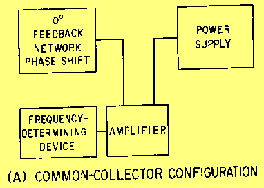 CONFIGURATION OF OSCILLATORS Any of the three basic amplifier configurations (common collector, common base, or common emitter) described in NEETS, Module 7, Introduction to Solid-State Devices and Power Supplies, Chapter 2, may be used for the oscillator circuit. However, certain considerations in the application of the circuit, such as the operating frequency and output power required, usually determine which of the three configurations is to be used. The three basic configurations are shown in figure 2-8, views (A), (B), and (C). Figure 2-8A. - Basic configurations. COMMON-COLLECTOR CONFIGURATION