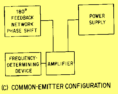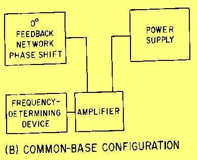 COMMON-COLLECTOR CONFIGURATION Since there is no phase reversal between the input and output circuits of a common-collector configuration, the feedback network does not need to provide a phase shift. However, since the voltage gain is less than unity and the power gain is low, the common-collector configuration is very seldom used in oscillator circuits. COMMON-BASE CONFIGURATION The power gain and voltage gain of the common-base configuration are high enough to give satisfactory operation in an oscillator circuit. The wide range between the input resistance and the output resistance make impedance matching slightly harder to achieve in the common-base circuit than in the common-emitter circuit. An advantage of the common-base configuration is that it exhibits better high-Frequency response than does the common-emitter configuration. COMMON-EMITTER CONFIGURATION The common-emitter configuration has high power gain and is used in low-frequency applications. For the energy which is fed back from the output to be in phase with the energy at the input, the feedback network of a common-emitter oscillator must provide a phase shift of approximately 180 degrees. An advantage of the common-emitter configuration is that the medium resistance range of the input and output simplifies the job of impedance matching. Q.6 What type of feedback aids an input signal? |