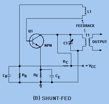 OSCILLATOR CIRCUITS Oscillators may be classified by name, such as Armstrong, Hartley, Colpitts, or by the manner in which dc power is applied. An oscillator in which dc power is supplied to the transistor through the tank circuit, or a portion of the tank circuit, is said to be SERIES FED. An oscillator which receives its dc power for the transistor through a path separate and parallel to the tank circuit is said to be PARALLEL FED OR SHUNT FED. All the oscillators in this chapter can be constructed either way, series or shunt fed. The construction depends on the characteristics of the oscillator circuit the designer is interested in. A SERIES-FED, TUNED-COLLECTOR ARMSTRONG OSCILLATOR is illustrated in figure 2-9 , view (A). The dc path is from the negative side (ground) of VCC through RE, Q1, T1, and back to the positive side of VCC. The figure clearly illustrates that both the ac and dc components flow through the tank circuit. Figure 2-9A. - Series- and shunt-fed, tuned-collector Armstrong oscillators. SERIES-FED