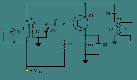 The circuit in view (D) has all three requirements for an oscillator: (1) amplification, (2) a frequency-determining device, and (3) regenerative feedback. The oscillator in this schematic drawing is a tuned-base oscillator, because the fdd is in the base circuit. If the fdd were in the collector circuit, it would be a tuned-collector oscillator. The circuit in view (D) is basically an Armstrong oscillator. Refer to figure 2-10, view (D), for the following discussion of the circuit operation of the Armstrong oscillator. When VCC is applied to the circuit. a small amount of base current flows through R2 which sets the forward bias on Q1. This forward bias causes collector current to flow from ground through Q1, R1, and L1 to +VCC. The current through L1 develops a magnetic field which induces a voltage into the tank circuit. The voltage is positive at the top of L2 and C1. At this time, two actions occur. First, resonant tank capacitor C1 charges to this voltage; the tank circuit now has stored energy. Second, coupling capacitor C2 couples the positive signal to the base of Q1. With a positive signal on its base, Q1 conducts harder. With Q1 conducting harder, more current flows through L1, a larger voltage is induced into L2, and a larger positive signal is coupled back to the base of Q1. While this is taking place, the frequency-determining device is storing more energy and C1 is charging to the voltage induced into L2. The transistor will continue to increase in conduction until it reaches saturation. At saturation, the collector current of Q1 is at a maximum value and cannot increase any further. With a steady current through L1, the magnetic fields are not moving and no voltage is induced into the secondary. With no external voltage applied, C1 acts as a voltage source and discharges. As the voltage across C1 decreases, its energy is transferred to the magnetic field of L2. Now, let's look at C2. The coupling capacitor, C2, has charged to approximately the same voltage as C1. As C1 discharges, C2 discharges. The primary discharge path for C2 is through R2 (shown by the dashed arrow). As C2 discharges, the voltage drop across R2 opposes the forward bias on Q1 and collector current begins to decrease. This is caused by the decreasing positive potential at the base of Q1. A decrease in collector current allows the magnetic field of L1 to collapse. The collapsing field of L1 induces a negative voltage into the secondary which is coupled through C2 and makes the base of Q1 more negative. This, again, is regenerative action; it continues until Q1 is driven into cutoff. When Q1 is cut off, the tank circuit continues to flywheel, or oscillate. The flywheel effect not only produces a sine-wave signal, but it aids in keeping Q1 cut off. Without feedback, the oscillations of L2 and C1 would dampen out after several cycles. To ensure that the amplitude of the signal remains constant, regenerative feedback is supplied to the tank once each cycle, as follows: As the voltage across C1 reaches maximum negative, C1 begins discharging toward 0 volts. Q1 is still below cutoff. C1 continues to discharge through 0 volts and becomes positively charged. The tank circuit voltage is again coupled to the base of Q1, so the base voltage becomes positive and allows collector current to flow. The collector current creates a magnetic field in L1, which is coupled into the tank. This feedback action replaces any lost energy in the tank circuit and drives Q1 toward saturation. After saturation is reached, the transistor is again driven into cutoff. The operation of the Armstrong oscillator is basically this: Power applied to the transistor allows energy to be applied to the tank circuit causing it to oscillate. Once every cycle, the transistor conducts for a short period of time (class C operation) and returns enough energy to the tank to ensure a constant amplitude output signal. Class C operation has high efficiency and low loading characteristics. The longer Q1 is cut off, the less the loading on the frequency-determining device. Figure 2-11 shows a tuned-base Armstrong oscillator as you will probably see it. R3 has been added to improve temperature stability. Bypass capacitor C3 prevents degeneration. C4 is an output coupling capacitor, and impedance-matching transformer T2 provides a method of coupling the output signal. T2 is usually a loosely coupled rf transformer which reduces undesired reflected impedance from the load back to the oscillator. Figure 2-11. - Tuned-base Armstrong oscillator.