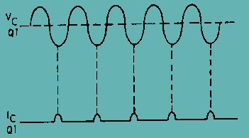 The Armstrong oscillator is an example of how a class C amplifier can produce a sine-wave output that is not distorted. Although class C operation is nonlinear and many harmonic frequencies are generated, only one frequency receives enough gain to cause the circuit to oscillate. This is the frequency of the resonant tank circuit. Thus, high efficiency and an undistorted output signal can be obtained. The waveforms in figure 2-12 illustrate the relationship between the collector voltage and collector current. Notice that collector current (IC) flows for only a short time during each cycle. While the tank circuit is oscillating (figure 2-11), L2 acts as the primary of the transformer and L1 acts as the secondary. The signal from the tank is, therefore, coupled through T1 to coupling capacitor C4, and the output voltage across L4 is a sine wave. Figure 2-12. - Collector current and voltage waveforms of a class C oscillator.