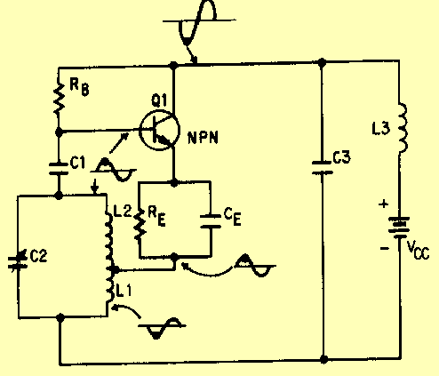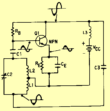 When a voltage is applied to the circuit, current from the battery flows through coil L1 and to the emitter through RE. Current then flows from the emitter to the collector and back to the battery. The surge of current through coil L1 induces a voltage in coil L2 to start oscillations within the tank circuit. When current first starts to flow through coil L1, the bottom of L1 is negative with respect to the top of L2. The voltage induced into coil L2 makes the top of L2 positive. As the top of L2 becomes positive, the positive potential is coupled to the base of Q1 by capacitor C1. A positive potential on the base results in an increase of the forward bias of Q1 and causes collector current to increase. The increased collector current also increases the emitter current flowing through coil L1. Increased current through L1 results in more energy being supplied to the tank circuit, which, in turn, increases the positive potential at the top of the tank (L2) and increases the forward bias of Q1. This action continues until the rate of current change through coil L1 can no longer increase. The current through coil L1 and the transistor cannot continue increasing indefinitely, or the coil and transistor will burn up. The circuit must be designed, by proper selection of the transistor and associated parts, so that some point is reached when the current can no longer continue to increase. At this point C2 has charged to the potential across L1 and L2. This is shown as the heavy dot on the base waveform. As the current through L1 decreases, the voltage induced in L2 decreases. The positive potential across the tank begins to decrease and C2 starts discharging through L1 and L2. This action maintains current flow through the tapped coil and causes a decrease in the forward bias of Q1. In turn, this decrease in the forward bias of Q1 causes the collector and emitter current to decrease. At the instant the potential across the tank circuit decreases to 0, the energy of the tank circuit is contained in the magnetic field of the coil. The oscillator has completed a half cycle of operation. Next, the magnetic field around L2 collapses as the current from C2 stops. The action of the collapsing magnetic field causes the top of L2 to become negative at this instant. The negative charge causes capacitor C2 to begin to charge in the opposite direction. This negative potential is coupled to the base of Q1, opposing its forward bias. Most transistor oscillators are operated class A; therefore, the positive and negative signals applied to the base of Q1 will not cause it to go into saturation or cutoff. When the tank circuit reaches its maximum negative value, the collector and the emitter currents will still be present but at a minimum value. The magnetic field will have collapsed and the oscillator will have completed 3/4 cycle. At this point C2 begins to discharge, decreasing the negative potential at the top of L2 (potential will swing in the positive direction). As the negative potential applied to the base of Q1 decreases, the opposition to the forward bias also decreases. This, in effect, causes the forward bias to begin increasing, resulting in increased emitter current flowing through L1. The increase in current through L1 causes additional energy to be fed to the tank circuit to replace lost energy. If the energy lost in the tank is replaced with an equal or larger amount of energy, oscillations will be sustained. The oscillator has now completed 1 cycle and will continue to repeat it over and over again. Shunt-Fed Hartley Oscillator A version of a SHUNT-FED HARTLEY OSCILLATOR is shown in figure 2-14. The parts in this circuit perform the same basic functions as do their counterparts in the series-fed Hartley oscillator. The difference between the series-fed and the shunt-fed circuit is that dc does not flow through the tank circuit. The shunt-fed circuit operation is essentially the same as the series-fed Hartley oscillator. When voltage is applied to the circuit, Q1 starts conducting. As the collector current of Q1 increases, the change (increase) is coupled through capacitor C3 to the tank circuit, causing it to oscillate. C3 also acts as an isolation capacitor to prevent dc from flowing through the feedback coil. The oscillations at the collector will be coupled through C3 (feedback) to supply energy lost within the tank. Figure 2-14. - Shunt-fed, tuned-base Hartley oscillator.