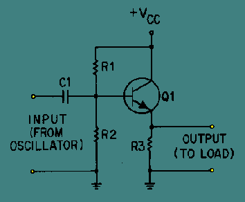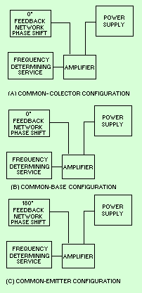 An oscillator has two stability requirements, AMPLITUDE STABILITY and FREQUENCY STABILITY. FEEDBACK is the process of transferring energy from a high-level point in a system to a low-level point. Feedback that aids the input signal is REGENERATIVE or POSITIVE. Feedback that opposes the input signal is DEGENERATIVE or NEGATIVE. The three basic circuit configurations used for oscillators are COMMON COLLECTOR, COMMON BASE, and COMMON EMITTER. In the COMMON-COLLECTOR configuration there is no PHASE SHIFT between input and output. It is not necessary for the feedback network to provide a phase shift. Voltage gain is less than unity (one) and power gain is low so it is very seldom used as an oscillator. In the COMMON-BASE configuration, there is no PHASE SHIFT between input and output. It is not necessary for the feedback network to provide a phase shift. Voltage and power gain are high enough to give satisfactory operation in an oscillator circuit. In the COMMON-EMITTER configuration, there is a 180-degree PHASE SHIFT between input and output. The feedback network must provide another phase shift of 180 degrees. It has a high power gain.