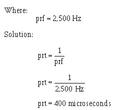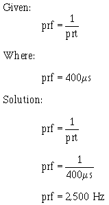 One alternation is called a PULSE. The time for one complete cycle is called the PULSE-REPETITION TIME (prt). The number of times in 1 second that the cycle repeats itself is called the PULSE-REPETITION FREQUENCY (prf) or PULSE-REPETITION RATE (prr). If each alternation in figure 3-2 is 200 microseconds (ms), the prt will be 400 microseconds, and the prf will be 2,500 hertz. The following examples are provided to illustrate the mathematical relationship between prf and prt: