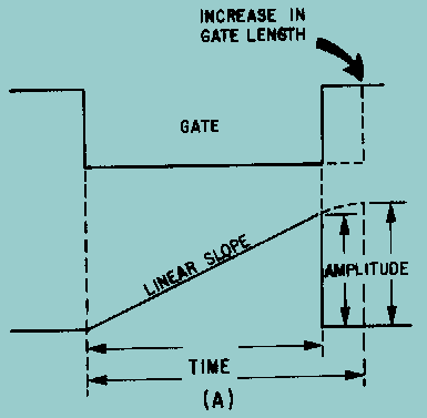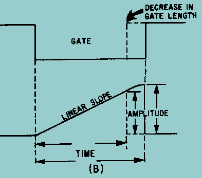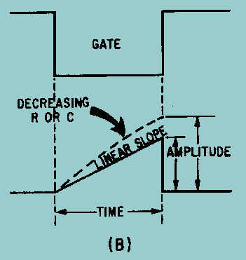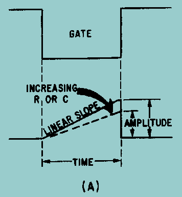 Decreasing the value of the TC (R2 or C2), as shown in figure 3-43, view (B), results in an increase in the number of time constants and therefore causes linearity to decrease. Anytime the number of time constants increases, the percentage of charge increases (see the Universal Time Constant Chart, figure 3-39), and amplitude (physical length) increases. Without an increase in gate length, the time that C2 is allowed to charge through R2 remains the same; therefore, electrical length remains the same. Linearity is affected by gate length, the value of R, and the value of C; but is not affected by changing the value of VCC. Increasing the gate length decreases linearity, and decreasing gate length increases linearity. Increasing R or C in the circuit increases linearity, and decreasing R or C in the circuit decreases linearity. The entire time of the sawtooth, from the time at which the capacitor begins charging (T0 in figure 3-41, view (B)) to the time when it starts charging again (T2), is known as the prt of the wave. The pulse repetition frequency of the sawtooth wave is: