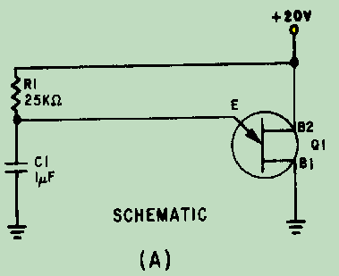 UNIJUNCTION SAWTOOTH GENERATOR. - So far, you have learned in this chapter that a switch and an RC network can generate a sawtooth waveform. When using a unijunction transistor as the switch, a simple sawtooth generator looks like the circuit in figure 3-44, view (A); the output waveshapes are shown in view (B). You may want to review unijunction transistors in NEETS, Module 7, Introduction to Solid-State Devices and Power Supplies, chapter 3, before continuing. Figure 3-44A. - Unijunction sawtooth generator. SCHEMATIC