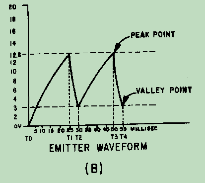 When the 20 volts is applied across B2 and B1, the n-type bar acts as a voltage- divider. A voltage of 12.8 volts appears at a point near the emitter. At the first instant, C1 has no voltage across it, so the output of the circuit, which is taken across the capacitor (C1), is equal to 0 volts. (The voltage across C1 is also the voltage that is applied to the emitter of the unijunction.) The unijunction is now reverse biased. After T0, C1 begins to charge toward 20 volts. At T1, the voltage across the capacitor (the voltage on the emitter) has reached approximately 12.8 volts. This is the peak point for the unijunction, and it now becomes forward biased. With the emitter forward biased, the impedance between the emitter and B1 is just a few ohms. This is similar to placing a short across the capacitor. The capacitor discharges very rapidly through the low resistance of B1 to E. As C1 discharges, the voltage from the emitter to B1 also decreases. Q1 will continue to be forward biased as long as the voltage across C1 is larger than the valley point of the unijunction. At T2 the 3-volt valley point of the unijunction has been reached. The emitter now becomes reverse biased and the impedance from the emitter to B1 returns to a high value. Immediately after T2, Q1 is reverse biased and the capacitor has a charge of approximately 3 volts. C1 now starts to charge toward 20 volts as it did originally (just after T0). This is shown from T2 to T3 in figure 3-44, view (B). Figure 3-44B. - Unijunction sawtooth generator. EMITTER WAVEFORM