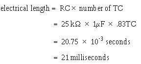This works out to be about 57 percent and is far beyond the 10 percent required for a linear sweep voltage. The linearity is very poor in this example. The electrical length (sweep time), which is measured from T2 to T3, can be found by multiplying RC times the number of time constants. Refer to the Universal Time Constant Chart (figure 3-39) again to find that 57 percent is 0.83TC. By multiplying 0.83 times R1C1, you will find that the electrical length is approximately 21 milliseconds: