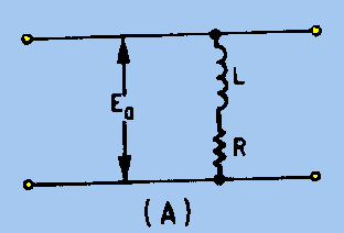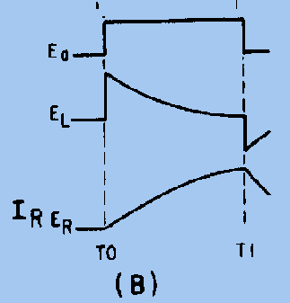 View (B) of figure 3-49 shows the waveforms when Ea is a square wave. Recall that the inductor acts as an open circuit at this first instant. Current now starts to flow and develops a voltage across the resistor. With a square wave applied, the voltage across the inductor starts to drop as soon as any voltage appears across the resistor. This is due to the fact that the voltage across the inductor and resistor must add up to the applied voltage. Figure 3-49B. - Series LR circuit.