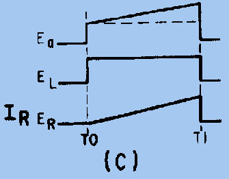 With Ea being a trapezoidal voltage, as shown in figure 3-49, view (C), the instant current flows, a voltage appears across the resistor, and the applied voltage increases. With an increasing applied voltage, the inductor voltage remains constant (EL) at the jump level and circuit current (IR) rises at a linear rate from the jump voltage point. Notice that if you add the inductor voltage (EL) and resistor voltage (ER) at any point between times T0 and T1, the sum is the applied voltage (Ea). The key fact here is that a trapezoidal voltage must be applied to a sweep coil to cause a linear rise of current. The linear rise of current will cause a uniform, changing magnetic field which, in turn, will cause an electron beam to move at a constant rate across a crt. Figure 3-49C. - Series LR circuit.