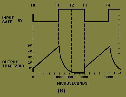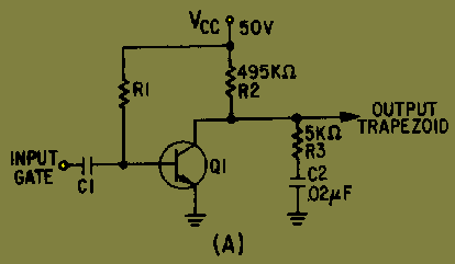 There are many ways to generate a trapezoidal waveshape. For example, the rectangular part could be generated in one circuit, the sawtooth portion in another, and the two combined waveforms in still a third circuit. A far easier, and less complex, way is to use an RC circuit in combination with a transistor to generate the trapezoidal waveshape in one stage. Figure 3-50, view (A), shows the schematic diagram of a trapezoidal generator. The waveshapes for the circuit are shown in view (B). R1 provides forward bias for Q1 and, without an input gate, Q1 conducts very hard (near saturation), C1 couples the input gate signal to the base of Q1. R2, R3, and C2 form the RC network which forms the trapezoidal wave. The output is taken across R3 and C2. Figure 3-50A. - Trapezoidal waveform generator.