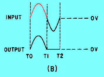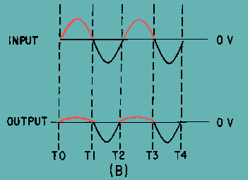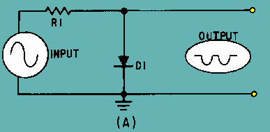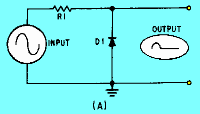 During the negative alternation of the input signal (T1 to T2), the diode is forward biased and conducts. The relatively low forward bias of D1 develops a very small voltage and, therefore, limits the output to nearly 0 volts. A voltage is developed across the resistor as current flows through the resistor and diode. |