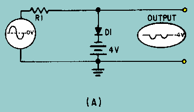 PARALLEL-POSITIVE LIMITER WITH BIAS. - Figure 4-10, view (A), shows the schematic diagram of a PARALLEL-POSITIVE LIMITER WITH NEGATIVE BIAS. The diode is forward biased and conducts without an input signal. D1 is essentially a short circuit. The voltage at the output terminals is -4 volts. Figure 4-10A. - Parallel limiter with negative bias.