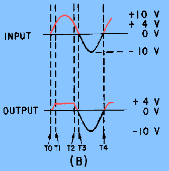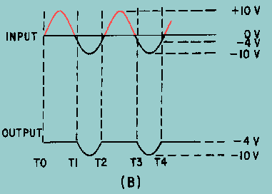 As the positive alternation of the input signal is applied (T0), the output voltage follows the input signal. From T1 to T2 the input signal is more positive than + 4 volts. The diode is forward biased and conducts. At this time the output voltage equals the bias voltage and limiting takes place. From T2 to T4 of the input signal, the diode is reverse biased and does not conduct. The output signal follows the input signal and no limiting takes place. This circuit is called a parallel-positive limiter with positive bias because limiting takes place in the positive alternation and positive bias is used on the diode. Parallel-Negative Limiter A PARALLEL-NEGATIVE LIMITER is shown in view (A) of figure 4-12. Notice the similarity of the parallel-negative limiter and the parallel-positive limiter shown in view (A) of figure 4-9. From T0 to T1 of the input signal, the diode is reverse biased and does not conduct, as shown in view (B) of figure 4-12. The output signal follows the input signal and the positive alternation is not limited. Figure 4-12A. - Parallel-negative limiter.