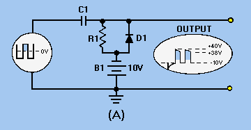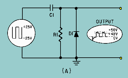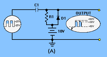 POSITIVE-DIODE CLAMPERS Figure 4-18, view (A), illustrates the circuit of a positive-diode clamper. Resistor R1 provides a discharge path for C1. This resistance is large in value so that the discharge time of C1 will be long compared to the input pulse width. The diode provides a fast charge path for C1. After C1 becomes charged it acts as a voltage source. The input wave shape shown in view (B) is a square wave and varies between +25 volts and -25 volts. Compare each portion of the input wave shape with the corresponding output wave shape. Keep Kirchhoff's law in mind: The algebraic sum of the voltage drops around a closed loop is 0 at any instant. Figure 4-18A. - Positive damper and waveform.