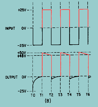 At T0 the -25 volt input signal appears across R1 and D1 (the capacitor is a short at the first instant). The initial voltage across R1 and D1 causes a voltage spike in the output. Because the charge time of C1 through D1 is almost instantaneous, the duration of the pulse is so short that it has only a negligible effect on the output. The -25 volts across D1 makes the cathode negative with respect to the anode and the diode conducts heavily. C1 quickly charges through the small resistance of D1. As the voltage across C1 increases, the output voltage decreases at the same rate. The voltage across C1 reaches -25 volts and the output is at 0 volts. At T1 the +25 volts already across the capacitor and the +25 volts from the input signal are in series and aid each other (SERIES AIDING). Thus, +50 volts appears across R1 and D1. At this time, the cathode of D1 is positive with respect to the anode, and the diode does not conduct. From T1 to T2, C1 discharges to approximately +23 volts (because of the large values of R and C) and the output voltage drops from +50 volts to +48 volts. At T2 the input signal changes from +25 volts to -25 volts. The input is now SERIES OPPOSING with the +23 volts across C1. This leaves an output voltage of -2 volts (-25 plus +23 volts). The cathode of D1 is negative with respect to the anode and D1 conducts. From T2 to T3, C1 quickly charges through D1 from +23 volts to +25 volts; the output voltage changes from -2 volts to 0 volts. At T3 the input signal and capacitor voltage are again series aiding. Thus, the output voltage felt across R1 and D1 is again +50 volts. During T3 and T4, C1 discharges 2 volts through R1. Notice that circuit operation from T3 to T4 is the same as it was from T1 to T2. The circuit operation for each square-wave cycle repeats the operation which occurred from T2 to T4. Compare the input wave shape of figure 4-18, view (B), with the output wave shape. Note the following important points: (1) The peak-to-peak amplitude of the input wave shape has not been changed by the clamper circuit; (2) the shape of the output wave shape has not been significantly changed from that of the input by the action of the clamper circuit; and (3) the output wave shape is now all above 0 volts whereas the input wave shape is both above and below 0 volts. Thus, the lower part of the input wave shape has been clamped to a dc potential of 0 volts in the output. This circuit is referred to as a positive clamper since all of the output wave shape is above 0 volts and the bottom is clamped at 0 volts. The positive clamper circuit is self-adjusting. This means that the bottom of the output waveform remains clamped at 0 volts during changes in input signal amplitude. Also, the output wave shape retains the form and peak-to-peak amplitude (50 volts in this case) of the input wave shape. When the input amplitude becomes greater, the charge of the capacitor becomes greater and the output amplitude becomes larger. When the input amplitude decreases, the capacitor does not charge as high as before and clamping occurs at a lower output voltage. The capacitor charge, therefore, changes with signal strength. The size of R1 and C1 has a direct effect upon the operation of the clamper. Because of the small resistance of the diode, the capacitor charge time is short. If either R1 or C1 is made smaller, the capacitor discharges faster (TC = R C). The ability of a smaller value capacitor to quickly discharge to a lower voltage is an advantage when the amplitude of the input wave shape is suddenly reduced. However, for normal clamper operation, quick discharge time is a disadvantage. This is because one objective of clamping is to keep the output wave shape the same as the input wave shape. If the small capacitor allows a relatively large amount of the voltage to discharge with each cycle, then distortion occurs in the output wave shape. A larger portion of the wave shape then appears on the wrong side of the reference line. Increasing the value of the resistor increases the discharge time (again, TC = R C). This increased value causes the capacitor to discharge more slowly and produces an output wave shape which is a better reproduction of the input wave shape. A disadvantage of increasing the resistance value is that the larger resistance increases the discharge time of the capacitor and slows the self-adjustment rate of the circuit, particularly in case a sudden decrease in input amplitude should occur. The larger resistance has no effect on self-adjustment with a sudden rise in input amplitude. This is because the capacitor charges through the small resistance of the conducting diode.Circuits often incorporate a compromise between a short RC time constant (for self-adjustment purposes) and a long RC time constant for less distortion. A point to observe is that the reverse resistance of the diode sometimes replaces the, physical resistor in the discharge path of the capacitor. Positive-Diode Clamper With Bias Biased clamping circuits operate in exactly the same manner as unbiased clampers, with one exception. That exception is the addition of a dc bias voltage in series with the diode and resistor. The size and polarity of this bias voltage determines the output clamping reference. View (A) of figure 4-19 illustrates the circuit of a positive clamper with positive bias. It can be identified as a positive clamper because the cathode of the diode is connected to the capacitor. Positive bias can be observed by noting that the negative side of the battery is connected to ground. The purposes and actions of the capacitor, resistor, and diode are the same as in the unbiased clamper circuit just discussed. Figure 4-19.A. - Positive clamper with positive bias.