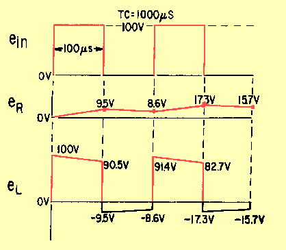 The RL circuit may also be used as an integrating circuit. An integrated waveform may be obtained from the series RL circuit by taking the output across the resistor. The characteristics of the inductor are such that at the first instant of time in which voltage is applied, current flow through the inductor is minimum and the voltage developed across it is maximum. Therefore, the value of the voltage drop across the series resistor at that first instant must be 0 volts because there is no current flow through it. As time passes, current begins to flow through the circuit and voltage develops across the resistor. Since the circuit has a long time constant, the voltage across the resistor does NOT respond to the rapid changes in voltage of the input square wave. Therefore, the conditions for integration in an RL circuit are a long time constant with the output taken across the resistor. These conditions are shown in figure 4-33. Figure 4-33. - RL integrator waveform.