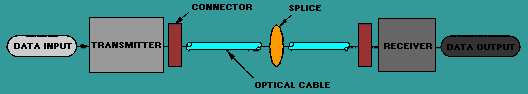 FIBER OPTIC DATA LINKS A fiber optic data link sends input data through fiber optic components and provides this data as output information. It has the following three basic functions: A fiber optic data link consists of three parts - transmitter, optical fiber, and receiver. Figure 1-1 is an illustration of a fiber optic data-link connection. The transmitter, optical fiber, and receiver perform the basic functions of the fiber optic data link. Each part of the data link is responsible for the successful transfer of the data signal. A fiber optic data link needs a transmitter that can effectively convert an electrical input signal to an optical signal and launch the data-containing light down the optical fiber. A fiber optic data link also needs a receiver that can effectively transform this optical signal back into its original form. This means that the electrical signal provided as data output should exactly match the electrical signal provided as data input. Figure 1-1. - Parts of a fiber optic data link. The transmitter converts the input signal to an optical signal suitable for transmission. The transmitter consists of two parts, an interface circuit and a source drive circuit. The transmitter's drive circuit converts the electrical signals to an optical signal. It does this by varying the current flow through the light source. The two types of optical sources are light-emitting diodes (LEDs) and laser diodes. The optical source launches the optical signal into the fiber. The optical signal will become progressively weakened and distorted because of scattering, absorption, and dispersion mechanisms in the fiber waveguides. Chapter 2 discusses the fiber mechanisms of scattering, absorption, and dispersion. Chapter 3 discusses the types of optical fibers and cables. The receiver converts the optical signal exiting the fiber back into an electrical signal. The receiver consists of two parts, the optical detector and the signal-conditioning circuits. An optical detector detects the optical signal. The signal-conditioning circuit conditions the detector output so that the receiver output matches the original input to the transmitter. The receiver should amplify and process the optical signal without introducing noise or signal distortion. Noise is any disturbance that obscures or reduces the quality of the signal. Noise effects and limitations of the signal-conditioning circuits cause the distortion of the receiver's electrical output signal. An optical detector can be either a semiconductor positive-intrinsic-negative (PIN) diode or an avalanche photodiode (APD). A PIN diode changes its electrical conductivity according to the intensity and wavelength of light. The PIN diode consists of an intrinsic region between p-type and n-type semiconductor material. Chapter 6 provides further explanation of optical sources. Chapter 7 provides further explanation of optical detectors. A fiber optic data link also includes passive components other than an optical fiber. Figure 1-1 does not show the optical connections used to complete the construction of the fiber optic data link. Passive components used to make fiber connections affect the performance of the data link. These components can also prevent the link from operating. Fiber optic components used to make the optical connections include optical splices, connectors, and couplers. Chapter 4 outlines the types of optical splices, connectors, and couplers and their connection properties that affect system performance. Proof of link performance is an integral part of the design, fabrication, and installation of any fiber optic system. Various measurement techniques are used to test individual parts of a data link. Each data link part is tested to be sure the link is operating properly. Chapter 5 discusses the laboratory and field measurements used to measure link performance. Q.2 Describe the basic functions of a fiber optic data link. |