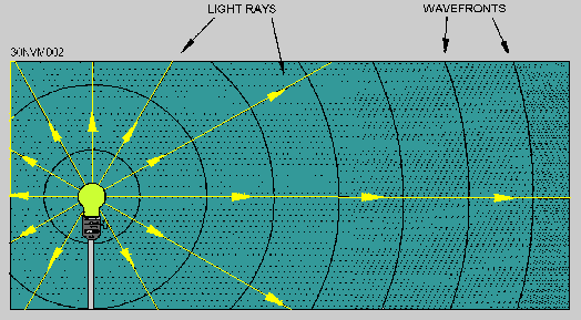 The exact nature of light is not fully understood, although people have been studying the subject for many centuries. In the 1700s and before, experiments seemed to indicate that light was composed of particles. In the early 1800s, a physicist Thomas Young showed that light exhibited wave characteristics. Further experiments by other physicists culminated in James Clerk (pronounced Clark) Maxwell collecting the four fundamental equations that completely describe the behavior of the electromagnetic fields. James Maxwell deduced that light was simply a component of the electromagnetic spectrum. This seems to firmly establish that light is a wave. Yet, in the early 1900s, the interaction of light with semiconductor materials, called the photoelectric effect, could not be explained with electromagnetic-wave theory. The advent of quantum physics successfully explained the photoelectric effect in terms of fundamental particles of energy called quanta. Quanta are known as photons when referring to light energy. Today, when studying light that consists of many photons, as in propagation, that light behaves as a continuum - an electromagnetic wave. On the other hand, when studying the interaction of light with semiconductors, as in sources and detectors, the quantum physics approach is taken. The wave versus particle dilemma can be addressed in a more formal way, but that is beyond the scope of this text. It suffices to say that much has been reconciled between the two using quantum physics. In this manual, we use both the electromagnetic wave and photon concepts, each in the places where it best matches the phenomenon we are studying. The electromagnetic energy of light is a form of electromagnetic radiation. Light and similar forms of radiation are made up of moving electric and magnetic forces. A simple example of motion similar to these radiation waves can be made by dropping a pebble into a pool of water. In this example, the water is not actually being moved by the outward motion of the wave, but rather by the up-and-down motion of the water. The up-and-down motion is transverse, or at right angles, to the outward motion of the waves. This type of wave motion is called transverse-wave motion. The transverse waves spread out in expanding circles until they reach the edge of the pool, in much the same manner as the transverse waves of light spread from the sun. However, the waves in the pool are very slow and clumsy in comparison with light, which travels approximately 186,000 miles per second. Light radiates from its source in all directions until it is absorbed or diverted by some substance (fig. 2-1). The lines drawn from the light source (a light bulb in this instance) to any point on one of the transverse waves indicate the direction that the wavefronts are moving. These lines, are called light rays. Figure 2-1. - Light rays and wavefronts from a nearby light source.