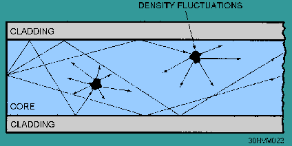 Signal attenuation is a log relationship. Length (L) is expressed in kilometers. Therefore, the unit of attenuation is decibels/kilometer (dB/km). As previously stated, attenuation is caused by absorption, scattering, and bending losses. Each mechanism of loss is influenced by fiber-material properties and fiber structure. However, loss is also present at fiber connections. Fiber connector, splice, and coupler losses are discussed in chapter 4. The present discussion remains relative to optical fiber attenuation properties. Q.38 Define attenuation. ABSORPTION. - Absorption is a major cause of signal loss in an optical fiber. Absorption is defined as the portion of attenuation resulting from the conversion of optical power into another energy form, such as heat. Absorption in optical fibers is explained by three factors: Imperfections in the atomic structure induce absorption by the presence of missing molecules or oxygen defects. Absorption is also induced by the diffusion of hydrogen molecules into the glass fiber. Since intrinsic and extrinsic material properties are the main cause of absorption, they are discussed further. Intrinsic Absorption. - Intrinsic absorption is caused by basic fiber-material properties. If an optical fiber were absolutely pure, with no imperfections or impurities, then all absorption would be intrinsic. Intrinsic absorption sets the minimal level of absorption. In fiber optics, silica (pure glass) fibers are used predominately. Silica fibers are used because of their low intrinsic material absorption at the wavelengths of operation. In silica glass, the wavelengths of operation range from 700 nanometers (nm) to 1600 nm. Figure 2-21 shows the level of attenuation at the wavelengths of operation. This wavelength of operation is between two intrinsic absorption regions. The first region is the ultraviolet region (below 400-nm wavelength). The second region is the infrared region (above 2000-nm wavelength). Figure 2-21. - Fiber losses. Intrinsic absorption in the ultraviolet region is caused by electronic absorption bands. Basically, absorption occurs when a light particle (photon) interacts with an electron and excites it to a higher energy level. The tail of the ultraviolet absorption band is shown in figure 2-21. The main cause of intrinsic absorption in the infrared region is the characteristic vibration frequency of atomic bonds. In silica glass, absorption is caused by the vibration of silicon-oxygen (Si-O) bonds. The interaction between the vibrating bond and the electromagnetic field of the optical signal causes intrinsic absorption. Light energy is transferred from the electromagnetic field to the bond. The tail of the infrared absorption band is shown in figure 2-21. Extrinsic Absorption. - Extrinsic absorption is caused by impurities introduced into the fiber material. Trace metal impurities, such as iron, nickel, and chromium, are introduced into the fiber during fabrication. Extrinsic absorption is caused by the electronic transition of these metal ions from one energy level to another. Extrinsic absorption also occurs when hydroxyl ions (OH-) are introduced into the fiber. Water in silica glass forms a silicon-hydroxyl (Si-OH) bond. This bond has a fundamental absorption at 2700 nm. However, the harmonics or overtones of the fundamental absorption occur in the region of operation. These harmonics increase extrinsic absorption at 1383 nm, 1250 nm, and 950 nm. Figure 2-21 shows the presence of the three OH- harmonics. The level of the OH- harmonic absorption is also indicated. These absorption peaks define three regions or windows of preferred operation. The first window is centered at 850 nm. The second window is centered at 1300 nm. The third window is centered at 1550 nm. Fiber optic systems operate at wavelengths defined by one of these windows. The amount of water (OH-) impurities present in a fiber should be less than a few parts per billion. Fiber attenuation caused by extrinsic absorption is affected by the level of impurities (OH-) present in the fiber. If the amount of impurities in a fiber is reduced, then fiber attenuation is reduced. Q.39 What are the main causes of absorption in optical fiber? SCATTERING. - Basically, scattering losses are caused by the interaction of light with density fluctuations within a fiber. Density changes are produced when optical fibers are manufactured. During manufacturing, regions of higher and lower molecular density areas, relative to the average density of the fiber, are created. Light traveling through the fiber interacts with the density areas as shown in figure 2-22. Light is then partially scattered in all directions. Figure 2-22. - Light scattering.