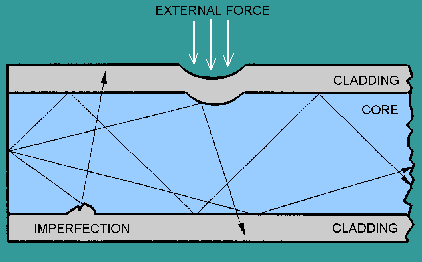 regions? BENDING LOSS. - Bending the fiber also causes attenuation. Bending loss is classified according to the bend radius of curvature: microbend loss or macrobend loss. Microbends are small microscopic bends of the fiber axis that occur mainly when a fiber is cabled. Macrobends are bends having a large radius of curvature relative to the fiber diameter. Microbend and macrobend losses are very important loss mechanisms. Fiber loss caused by microbending can still occur even if the fiber is cabled correctly. During installation, if fibers are bent too sharply, macrobend losses will occur. Microbend losses are caused by small discontinuities or imperfections in the fiber. Uneven coating applications and improper cabling procedures increase microbend loss. External forces are also a source of microbends. An external force deforms the cabled jacket surrounding the fiber but causes only a small bend in the fiber. Microbends change the path that propagating modes take, as shown in figure 2-23. Microbend loss increases attenuation because low-order modes become coupled with high-order modes that are naturally lossy. Figure 2-23. - Microbend loss. Macrobend losses are observed when a fiber bend's radius of curvature is large compared to the fiber diameter. These bends become a great source of loss when the radius of curvature is less than several centimeters. Light propagating at the inner side of the bend travels a shorter distance than that on the outer side. To maintain the phase of the light wave, the mode phase velocity must increase. When the fiber bend is less than some critical radius, the mode phase velocity must increase to a speed greater than the speed of light. However, it is impossible to exceed the speed of light. This condition causes some of the light within the fiber to be converted to high-order modes. These high-order modes are then lost or radiated out of the fiber. Fiber sensitivity to bending losses can be reduced. If the refractive index of the core is increased, then fiber sensitivity decreases. Sensitivity also decreases as the diameter of the overall fiber increases. However, increases in the fiber core diameter increase fiber sensitivity. Fibers with larger core size propagate more modes. These additional modes tend to be more lossy. Q.44 Microbend loss is caused by microscopic bends of the fiber axis. List three