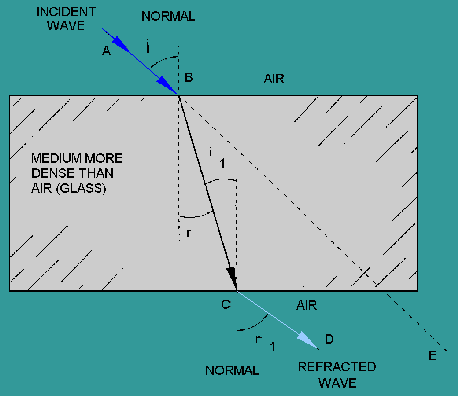 REFRACTION OF LIGHT When a light wave passes from one medium into a medium having a different velocity of propagation (the speed waves can travel through a medium), a change in the direction of the wave will occur. This change of direction as the wave enters the second medium is called refraction. As in the discussion of reflection, the wave striking the boundary (surface) is called the incident wave, and the imaginary line perpendicular to the boundary is called the normal. The angle between the incident wave and the normal is called the angle of incidence. As the wave passes through the boundary, it is bent either toward or away from the normal. The angle between the normal and the path of the wave through the second medium is the angle of refraction. A light wave passing through a block of glass is shown in figure 2-5. The wave moves from point A to point B at a constant speed. This is the incident wave. As the wave penetrates the glass boundary at point B, the velocity of the wave is slowed down. This causes the wave to bend toward the normal. The wave then takes the path from point B to point C through the glass and becomes both the refracted wave from the top surface and the incident wave to the lower surface. As the wave passes from the glass to the air (the second boundary), it is again refracted, this time away from the normal, and takes the path from point C to point D. After passing through the last boundary, the velocity increases to the original velocity of the wave. As illustrated, refracted waves can bend toward or away from the normal. This bending depends on the velocity of the wave through different mediums. The broken line between points B and E is the path that the wave would travel if the two mediums (air and glass) had the same density. Figure 2-5. - Refraction of a wave. Another interesting condition can be shown using figure 2-5. If the wave passes from a less dense to a more dense medium, it is bent toward the normal, and the angle of refraction (r) is less than the angle of incidence (i). Likewise, if the wave passes from a more dense to a less dense medium, it is bent away from the normal, and the angle of refraction (r1) is greater than the angle of incidence (i1). An example of refraction is the apparent bending of a spoon when it is immersed in a cup of water. The bending seems to take place at the surface of the water, or exactly at the point where there is a change of density. Obviously, the spoon does not bend from the pressure of the water. The light forming the image of the spoon is bent as it passes from the water (a medium of high density) to the air (a medium of comparatively low density). Without refraction, light waves would pass in straight lines through transparent substances without any change of direction. Figure 2-5 shows that rays striking the glass at any angle other than perpendicular are refracted. However, perpendicular rays, which enter the glass normal to the surface, continue through the glass and into the air in a straight line - no refraction takes place. Q.10 A refracted wave occurs when a wave passes from one medium into another medium.