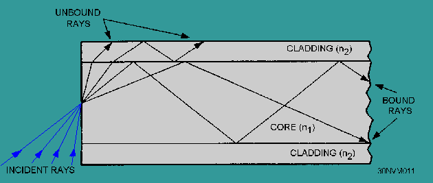 PROPAGATION OF LIGHT ALONG A FIBER The concept of light propagation, the transmission of light along an optical fiber, can be described by two theories. According to the first theory, light is described as a simple ray. This theory is the ray theory, or geometrical optics, approach. The advantage of the ray approach is that you get a clearer picture of the propagation of light along a fiber. The ray theory is used to approximate the light acceptance and guiding properties of optical fibers. According to the second theory, light is described as an electromagnetic wave. This theory is the mode theory, or wave representation, approach. The mode theory describes the behavior of light within an optical fiber. The mode theory is useful in describing the optical fiber properties of absorption, attenuation, and dispersion. These fiber properties are discussed later in this chapter. Q.21 Light transmission along an optical fiber is described by two theories. Which theory is used to approximate the light acceptance and guiding properties of an optical fiber? Ray Theory Two types of rays can propagate along an optical fiber. The first type is called meridional rays. Meridional rays are rays that pass through the axis of the optical fiber. Meridional rays are used to illustrate the basic transmission properties of optical fibers. The second type is called skew rays. Skew rays are rays that travel through an optical fiber without passing through its axis. MERIDIONAL RAYS. - Meridional rays can be classified as bound or unbound rays. Bound rays remain in the core and propagate along the axis of the fiber. Bound rays propagate through the fiber by total internal reflection. Unbound rays are refracted out of the fiber core. Figure 2-10 shows a possible path taken by bound and unbound rays in a step-index fiber. The core of the step-index fiber has an index of refraction n1. The cladding of a step-index has an index of refraction n2, that is lower than n1. Figure 2-10 assumes the core-cladding interface is perfect. However, imperfections at the core-cladding interface will cause part of the bound rays to be refracted out of the core into the cladding. The light rays refracted into the cladding will eventually escape from the fiber. In general, meridional rays follow the laws of reflection and refraction. Figure 2-10. - Bound and unbound rays in a step-index fiber.