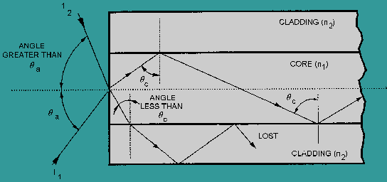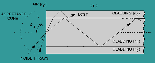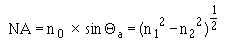 The acceptance angle is related to the refractive indices of the core, cladding, and medium surrounding the fiber. This relationship is called the numerical aperture of the fiber. The numerical aperture (NA) is a measurement of the ability of an optical fiber to capture light. The NA is also used to define the acceptance cone of an optical fiber. Figure 2-12 illustrates the relationship between the acceptance angle and the refractive indices. The index of refraction of the fiber core is n1. The index of refraction of the fiber cladding is n2. The index of refraction of the surrounding medium is n0. By using Snell's law and basic trigonometric relationships, the NA of the fiber is given by: