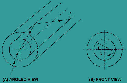 Since the medium next to the fiber at the launching point is normally air, n0 is equal to 1.00. The NA is then simply equal to sin Θa. The NA is a convenient way to measure the light-gathering ability of an optical fiber. It is used to measure source-to-fiber power-coupling efficiencies. A high NA indicates a high source-to-fiber coupling efficiency. Source-to-fiber coupling efficiency is described in chapter 6. Typical values of NA range from 0.20 to 0.29 for glass fibers. Plastic fibers generally have a higher NA. An NA for plastic fibers can be higher than 0.50. In addition, the NA is commonly used to specify multimode fibers. However, for small core diameters, such as in single mode fibers, the ray theory breaks down. Ray theory describes only the direction a plane wave takes in a fiber. Ray theory eliminates any properties of the plane wave that interfere with the transmission of light along a fiber. In reality, plane waves interfere with each other. Therefore, only certain types of rays are able to propagate in an optical fiber. Optical fibers can support only a specific number of guided modes. In small core fibers, the number of modes supported is one or only a few modes. Mode theory is used to describe the types of plane waves able to propagate along an optical fiber. SKEW RAYS. - A possible path of propagation of skew rays is shown in figure 2-13. Figure 2-13, view A, provides an angled view and view B provides a front view. Skew rays propagate without passing through the center axis of the fiber. The acceptance angle for skew rays is larger than the acceptance angle of meridional rays. This condition explains why skew rays outnumber meridional rays. Skew rays are often used in the calculation of light acceptance in an optical fiber. The addition of skew rays increases the amount of light capacity of a fiber. In large NA fibers, the increase may be significant. Figure 2-13. - Skew ray propagation: A. Angled view; B. Front view.