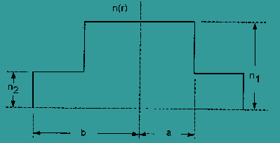 MULTIMODE STEP-INDEX FIBERS A multimode step-index fiber has a core of radius (a) and a constant refractive index n1. A cladding of slightly lower refractive index n2 surrounds the core. Figure 3-2 shows the refractive index profile n(r) for this type of fiber. n(r) is equal to n1 at radial distances r < a (core). n(r) is equal to n2 at radial distances r ≥ a (cladding). Notice the step decrease in the value of refractive index at the core-cladding interface. This step decrease occurs at a radius equal to distance (a). The difference in the core and cladding refractive index is the parameter Δ: