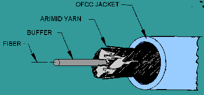 CABLE DESIGNS Manufacturers design fiber optic cables for specific applications. Is the cable buried underground or hung from telephone poles? Is the cable snaked through cableways, submerged in water, or just laid on the ground? Is the cable used in industrial, telecommunication, utility, or military applications? Each different application may require a slightly different cable design. Agreement on standard cable designs is difficult. Cable design choices include jacket materials, water blocking techniques, and the number of fibers to place within the cable. The cable design chosen depends on the cable's intended application. There are presently many types of fiber optic cables. Some fiber optic cables are used in commercial applications, while others are used in military applications. Standard commercial cable designs will develop over time as fiber optic technology becomes more established. However, this chapter provides only a short discussion on cable designs considered for Navy applications. Navy systems require that fiber optic cables meet stringent environmental conditions. The types of cable designs considered by the Navy include the optical fiber cable component (OFCC), stranded, and ribbon cable designs. The cable must meet minimal levels of performance in safety (low smoke, low toxicity, low halogen content, etc.), durability (able to withstand shock, vibration, fluids, etc.), and optical performance. The cable must also be easy to install and repair. These factors greatly influence the design of the cables. Optical Fiber Cable Component (OFCC) Cable An OFCC cable consists of individual single fiber cables, called optical fiber cable components (OFCCs). OFCCs are a tight-buffered fiber surrounded by arimid yarn and a low-halogen outer jacket. The OFCC outer diameter is typically 2 millimeters (mm). The fiber is typically buffered with a polyester elastomer to a total diameter of 900 μm. Figure 3-14 illustrates the design of the OFCCs. The size of the OFCCs limits the amount of fibers contained within an OFCC cable. An OFCC cable generally contains less than 36 fibers (OFCCs). An OFCC cable of 0.5-inch cable outer diameter can accommodate about 12 fibers. Figure 3-14. - The design of optical fiber cable components (OFCCs).